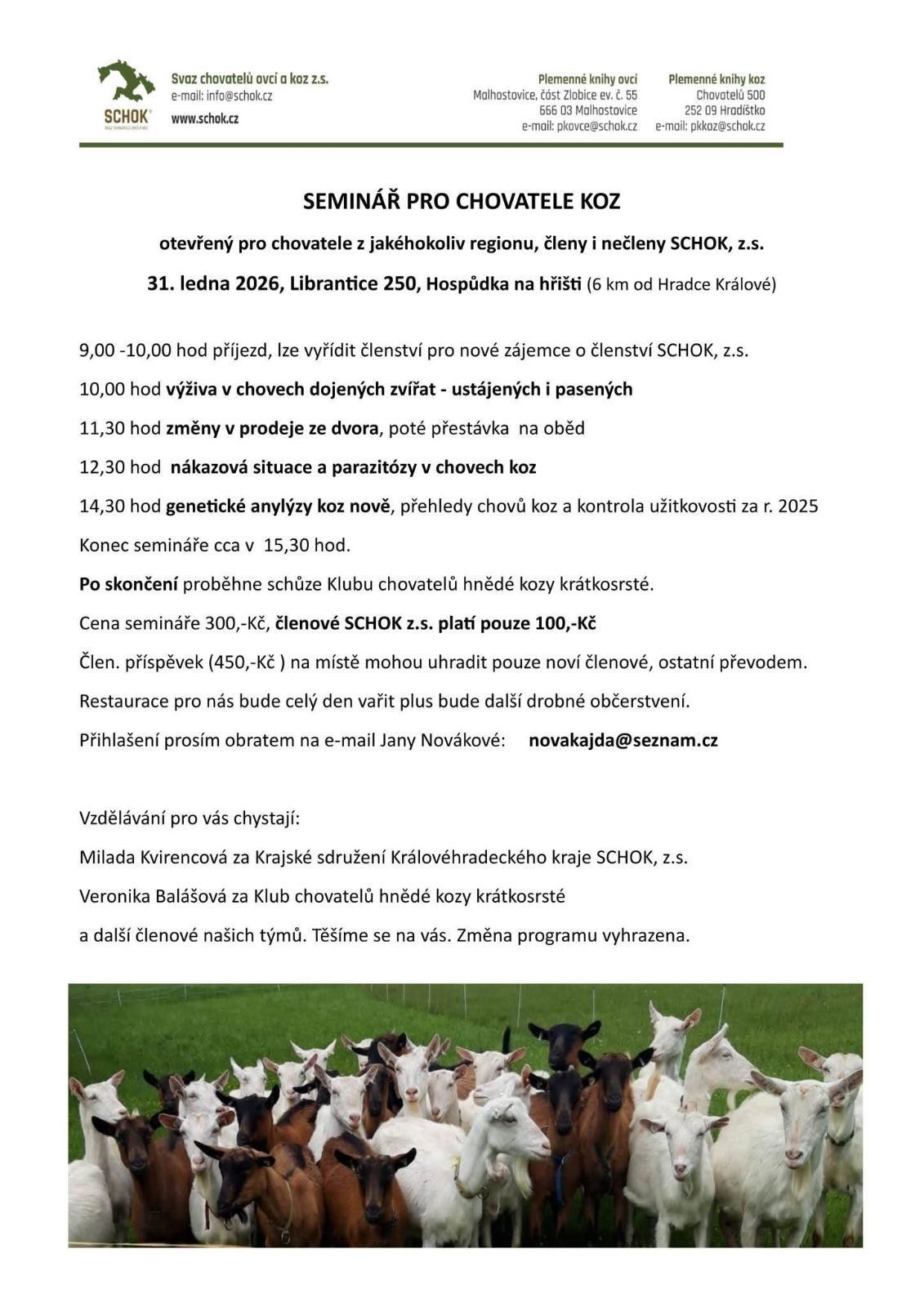 Krajské sdružení Královéhradeckého kraje a Klub chovatelů hnědé kozy krátkosrsté zvou chovatele z jakéhokoli regionu, členy i nečleny SCHOK na seminář. Akce proběhne 31. 1. v Hospůdce na hřišti, Librantice 250.